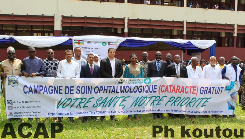 Bangui, 8 déc. (ACAP) – La Première Dame de la République centrafricaine, Mme Tina Marguerite Touadéra, a présidé lundi 8 décembre 2025 à l’Hôpital général de Bangui la cérémonie officielle de lancement de la campagne gratuite de soins ophtalmologiques consacrée à la prise en charge de la cataracte.